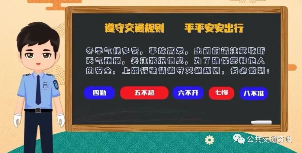 冬季氣候多變,事故高發(fā),出門前請注意收聽天氣預(yù)報,關(guān)注路況信息,為了確保您和他人的安全, 上路行駛請遵守交通規(guī)則,務(wù)必做到:四勤、五不超、六不開、七慢、八不準 。