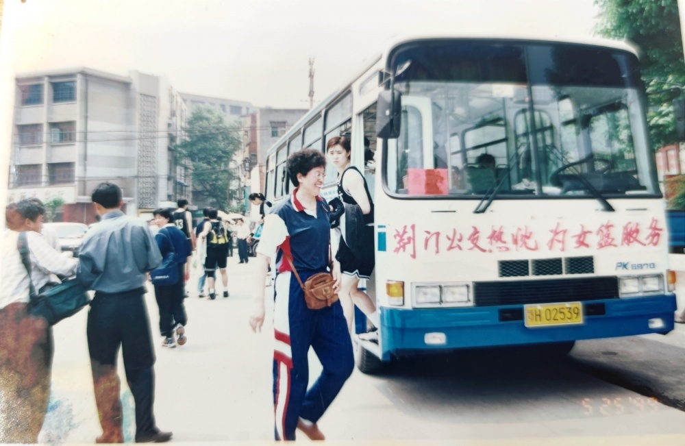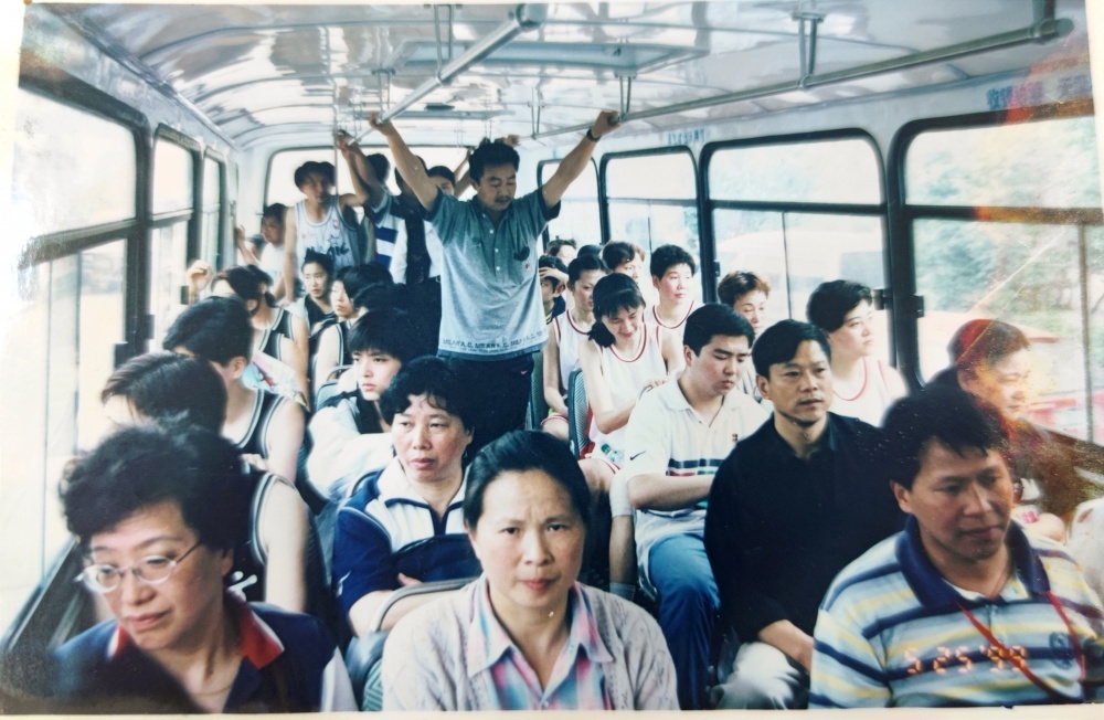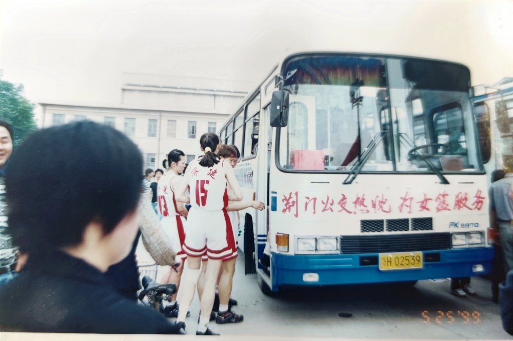 ▲1999年5月25日,沈陽電梯隊(duì)隊(duì)員、教練乘坐公交出行。公交車頭還掛有“荊門公交熱忱為女籃服務(wù)”橫幅。