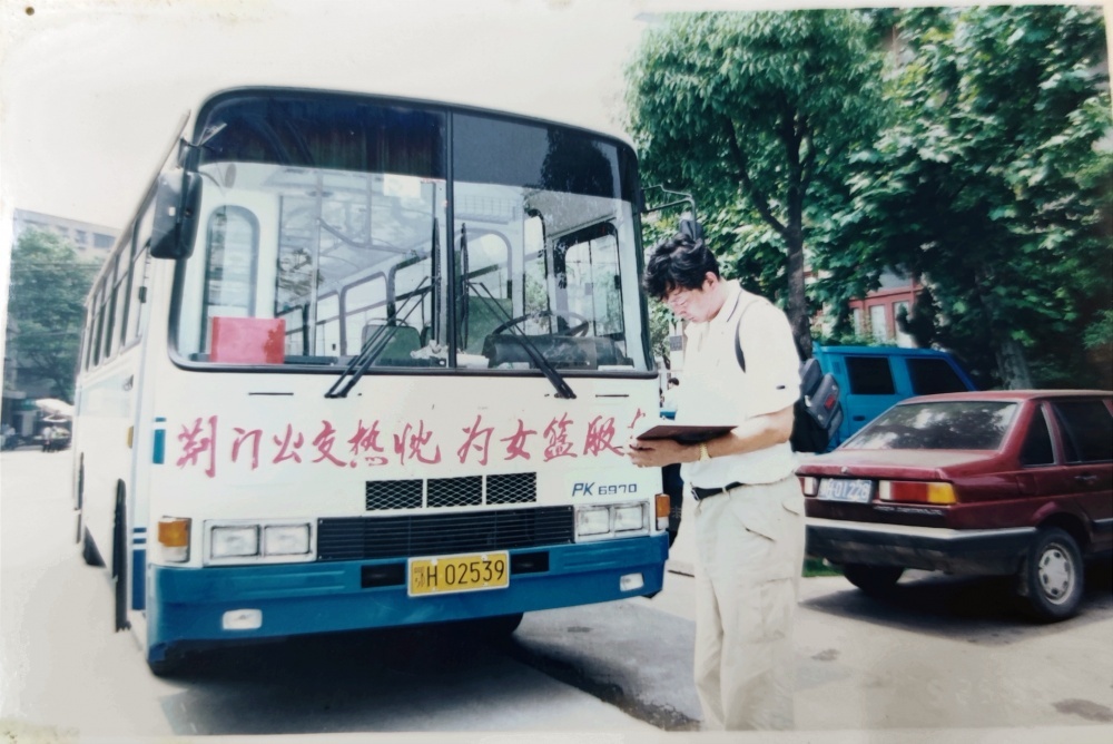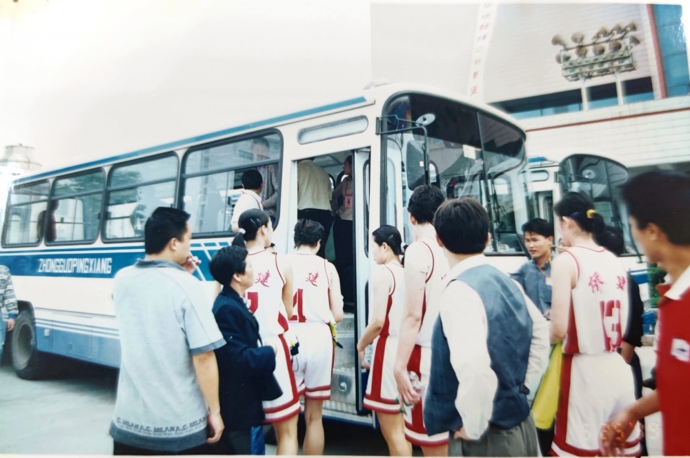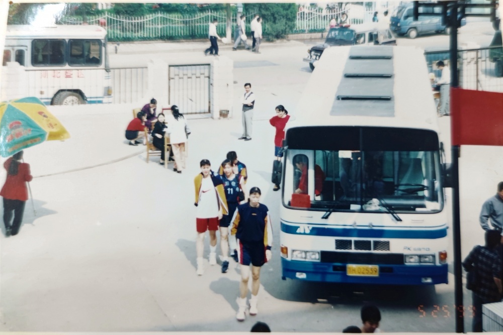 ▲1999年5月25日,到達(dá)荊門石化體育館。遠(yuǎn)處看女藍(lán)隊(duì)員走過公交車,個(gè)頭真的高。