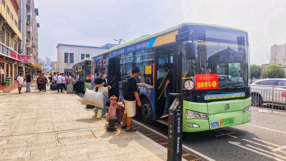 9月6日早上6點00分,市公交集團將掛有“迎新專車”牌子的定制專車車隊,整齊地停靠在火車站北廣場進行等待。