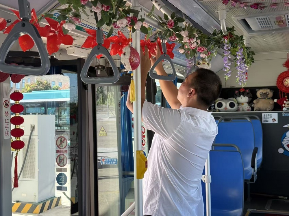 張峻峰是荊門公交2024年度“最美公交人”,他的車上總比別人多點(diǎn)“暖心”東西:駕駛座旁的小盒子里備著暈車藥、創(chuàng)可貼和折疊傘?!敖衲陣?guó)慶,就想乘客上車能樂(lè)呵樂(lè)呵。”于是張峻峰就動(dòng)了裝飾車廂的念頭。他自費(fèi)買了小國(guó)旗、風(fēng)車、燈籠等裝飾,晚上在家剪剪貼貼,白天利用休息時(shí)間在車上裝飾。張峻峰的行動(dòng),也是荊門公交服務(wù)提升的一個(gè)縮影。